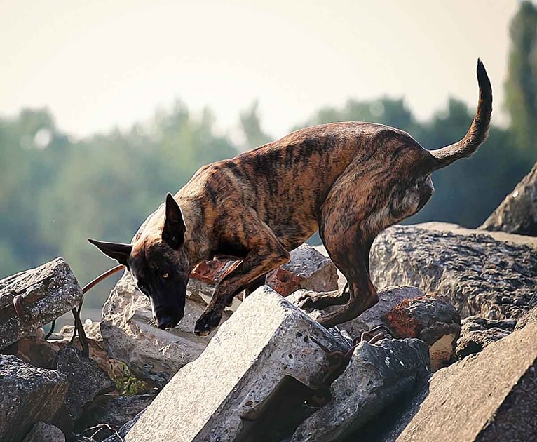 Der sogenannte Trümmersuchhund kommt dort zum Einsatz, wo ein Schadensereignis vorliegt, wie z. B. bei einem eingestürzten Haus nach einer Gasexplosion. Oftmals gibt es keinen visuellen oder auditiven Kontakt mehr zu vermissten Personen. Diese punktgenaue Lokalisierung hilft der technischen Hilfe vor Ort, an der korrekten Stelle Rettungsmaßnahmen durchzuführen.